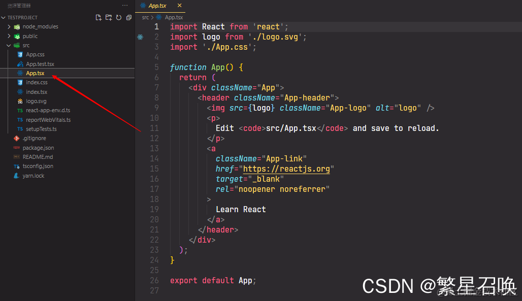 在vscode中打开项目,可以看到顺利生成了react项目且组件的后缀为tsx,此时说明成功创建了react+typescript项目的雏形