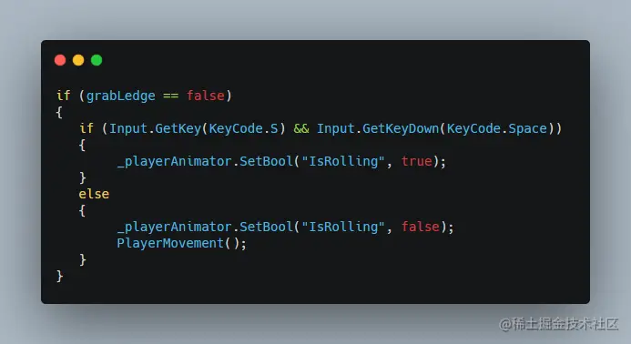 然后在播放器脚本的更新函数中,我们需要设置启用滚动动画的条件,在这种情况下,当播放器在运行时按住S键并按下空格键。