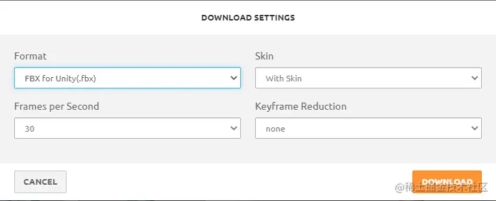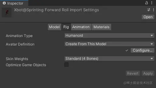 下载完成后,我们需要对其进行配置,以便在我们的游戏中使用,因此我们首先将下载的动画拖到unity中,选择文件,并将其改为以下设置