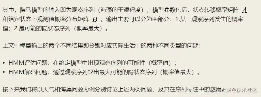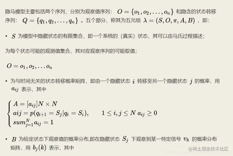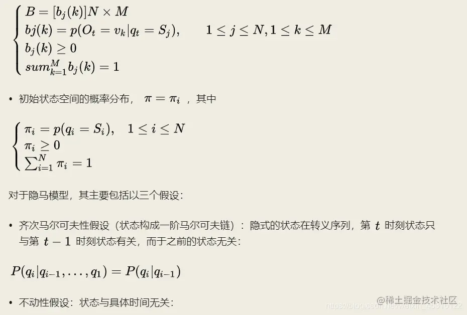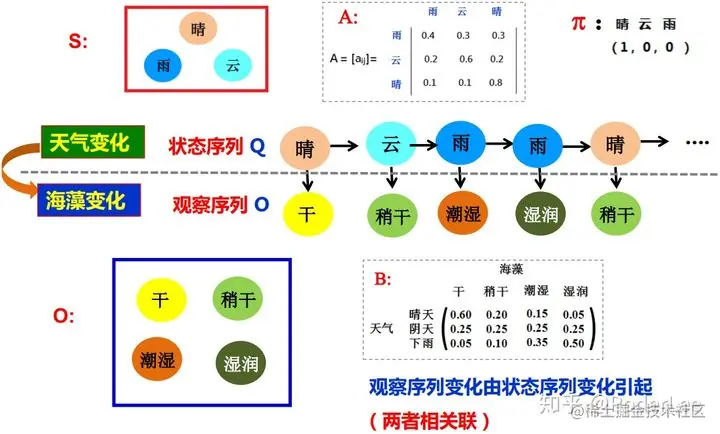 隐马模型的主要参数即为两个矩阵A,B .A:隐状态转移概率矩阵和 B:给定状态下观察值的概率分布。