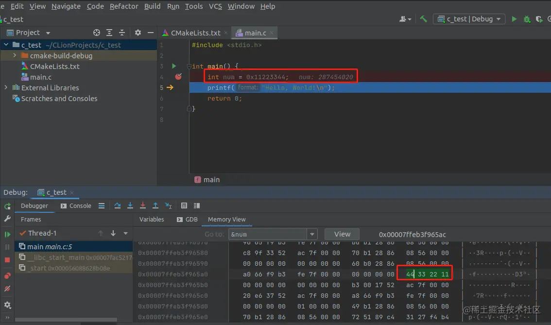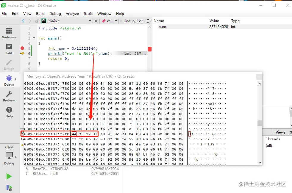 上图 ,我定义了一个 int num,int 占4个字节,0x 是16进制写法,所以 11 会占一个字节,22,占一个字节,类推。