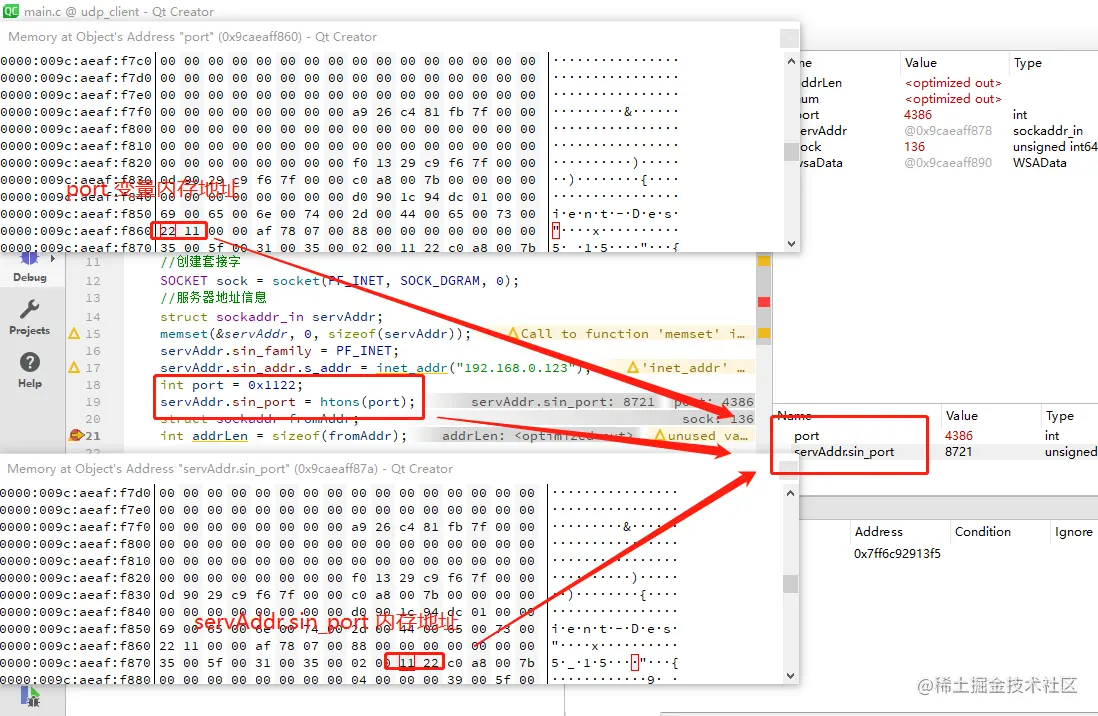 上面的代码是 udp client 的部分代码,定义了 端口是 0x1122,因为我电脑是小端序,所以内存排列是 0x2211。但是经过 htons() 函数转换之后,内存排列就变成了 0x1122。