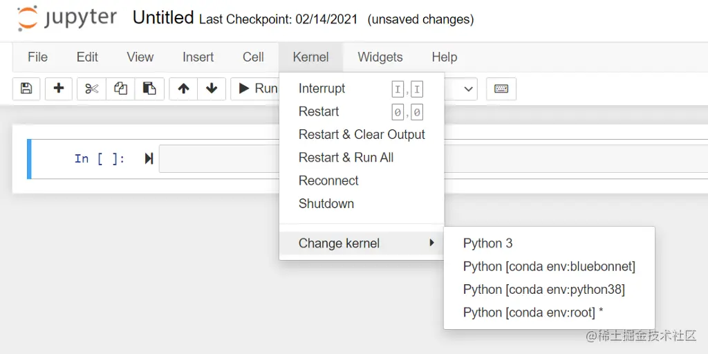 在一个新的Jupyter笔记本打开后,你可以点击Kernel >Change kernel > 并选择你需要的虚拟环境。