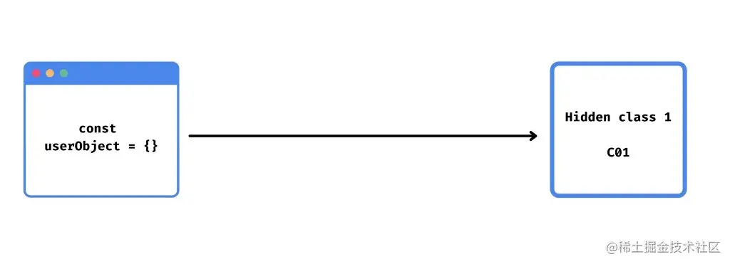 所以,当我创建一个空对象(const userObject = {} )时,V8将创建一个相应的没有任何偏移的隐藏类(C01)。