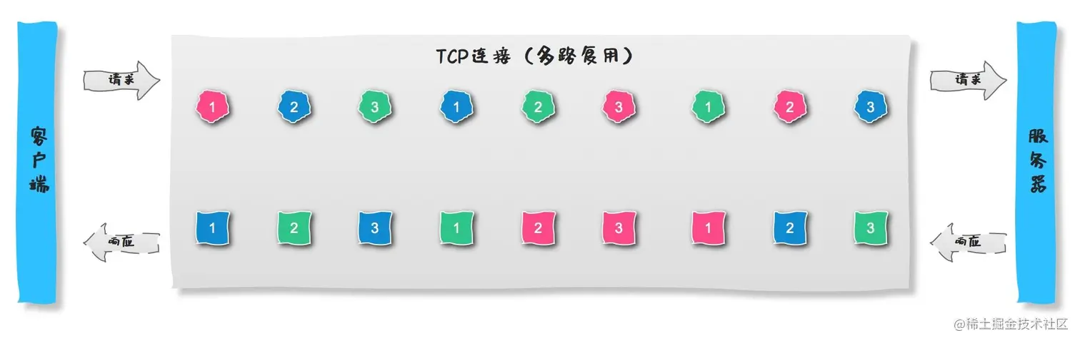 同一个tcp连接的所有请求都是共享连接的,同一个域名只是用一个TCP连接。每个request对应一个id, 客户端和服务器可以把 HTTP 消息分解为互不依赖的帧,然后乱序发送,最后再在另一端把它们重新组合起来。