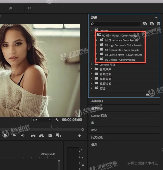 在“Presets”中就能看到安装好的pr调色预设了,如下图: