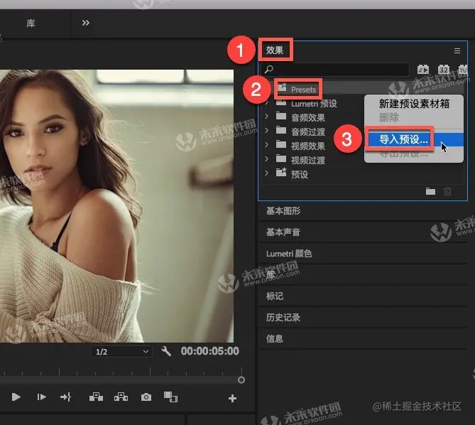 打开Adobe Premiere mac版,导入媒体项目后,在左下角找到“效果”,选中“Presets”后右击鼠标,点击“导入预设”,如下图: