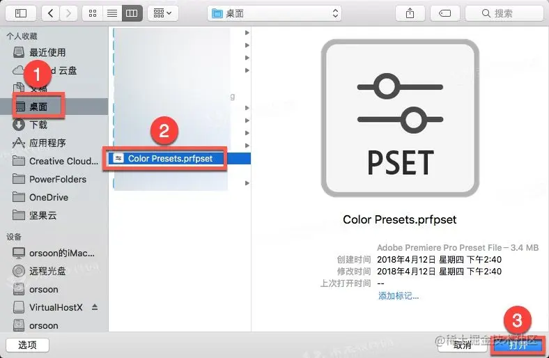 弹出选择窗口,在桌面找到并选择“Color Presets.prfpset”,点击“打开”,如下图: