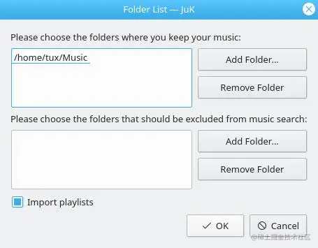 当你第一次启动 Juk 时,你会被问到你想用什么目录作为你的音乐集的来源。选择你希望 Juk 寻找音乐的文件夹,并可选择排除你希望 Juk 忽略的任何子目录。