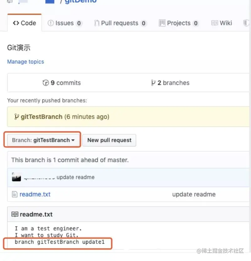 在GitHub上查看master分支和gitTestBranch分支的对比,可见gitTestBranch已成功push: