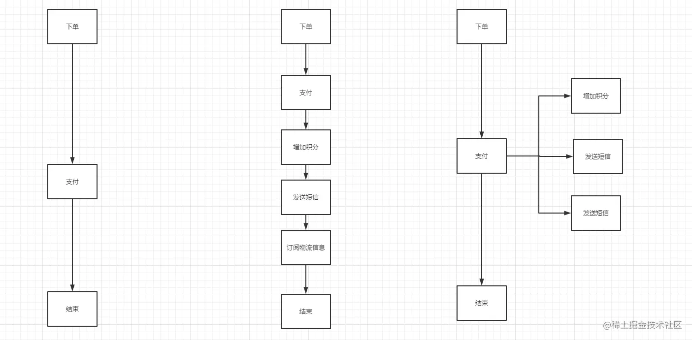 - 原来的下单场景只是用户支付即可结束,现在需要发送成功短信,给用户增加积分,订阅物流信息等等,这就使得用户的 下单时间大大加长,这样就可以使用消息队列,把各个动作发到消息队列,每个服务再去拉取消息队列中的东西进行处理.大大减少时间