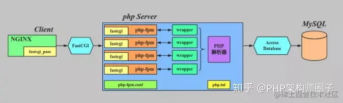 - Nginx 把请求翻译成fastcgi请求(标准输入)发给fpm