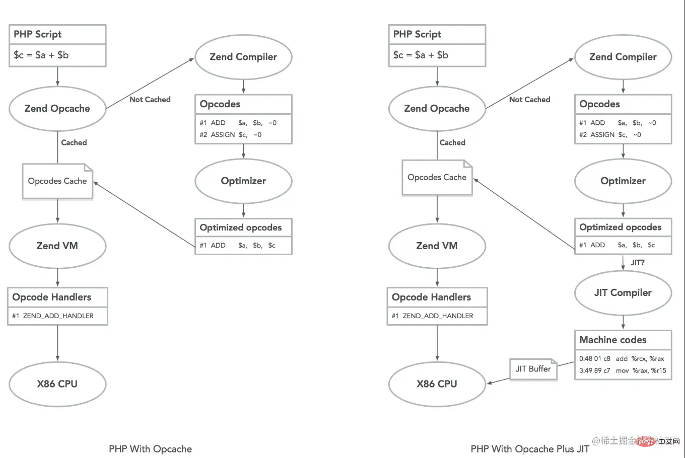 JIT在Opcache优化之后的基础上,再次优化,直接生成机器码,直接由CPU执行(不在需要ZEND VM虚拟机执行),目前PHP8只支持x86架构的CPU
