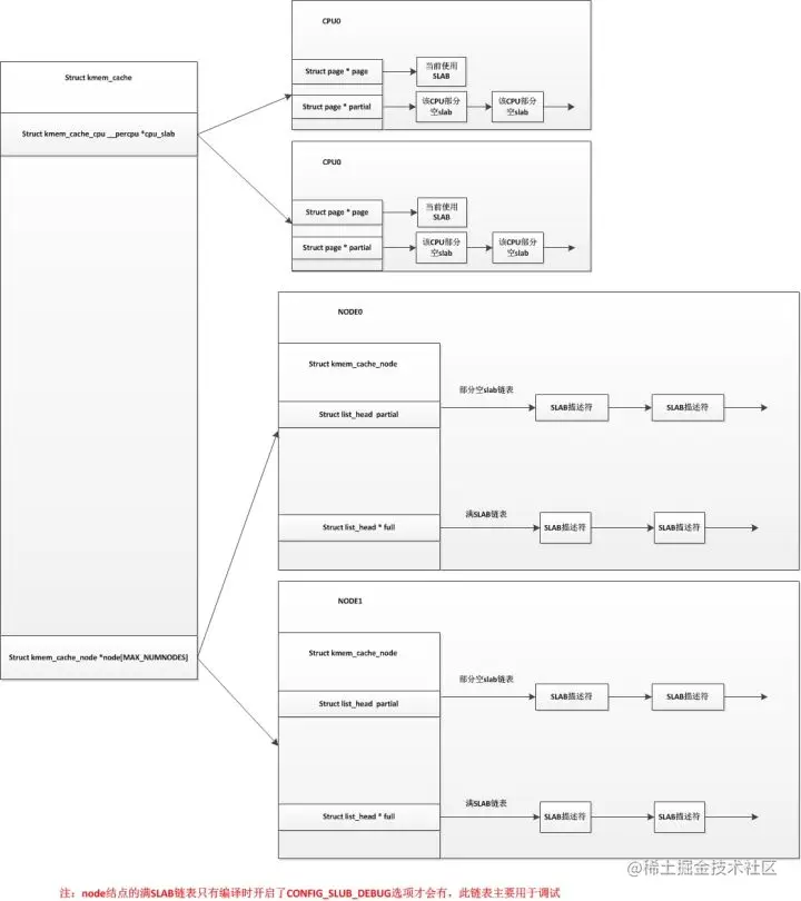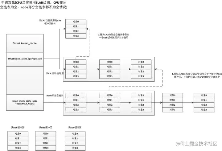 - 这样看来只有空闲的slab缓冲区会被放入node结点的部分空链表中,这只是从释放对象的角度看是这样的,当刷新kmem_cache时,会将kmem_cache中所有的slab缓冲区放回到node结点的部分空链表(也包括当前CPU使用的slab缓冲区),这种情况node结点的部分空链表就会有部分空slab缓冲区了。而还有一种情况就是编译时禁用了CPU的部分空链表,即CPU只有一个当前使用的slab缓冲区,这样其他的部分空缓冲区都会保存在node结点的部分空链表上,更多详细细节请看内核源码中的mm/slub.c文件。