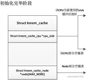 初始化完成后,slub中并没有一个slab缓冲区,只有在第一次申请时,才会从伙伴系统中获取一段连续页框作为一个slab缓冲区,如下: