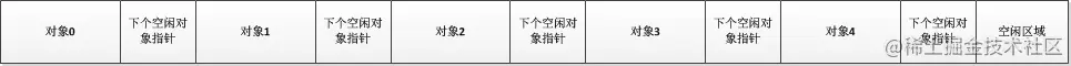 size:size = 对象大小 + 对象后面紧跟的下个空闲对象指针。
