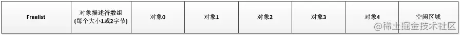 - 而在SLUB分配器的slab缓冲区结构中,已经没有了对象描述符数组,而freelist也拆分成了每个对象有一个指向下一个对象的指针,如下: