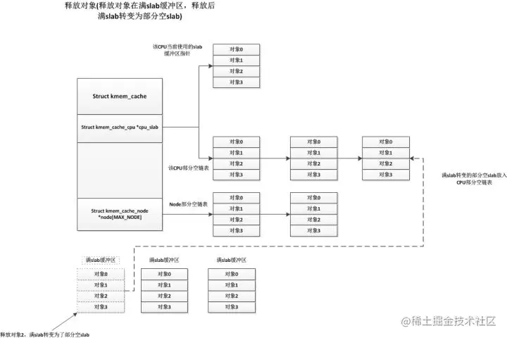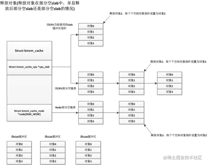 各种情况的申请对象都已经说明了,接下来我们说说释放对象的情况,释放对象也分很多种,我们先说说最简单的一种释放情况,就是部分空的slab释放其中一个使用着的对象,释放后这个部分空slab还是部分空slab(有些部分空slab只使用了一个对象,释放这个对象后就变为空闲slab),这些部分空slab可能处于CPU当前使用slab,CPU部分空链表,node部分空链表中,但是它们的处理都是一样的,直接释放掉该对象即可,如下: