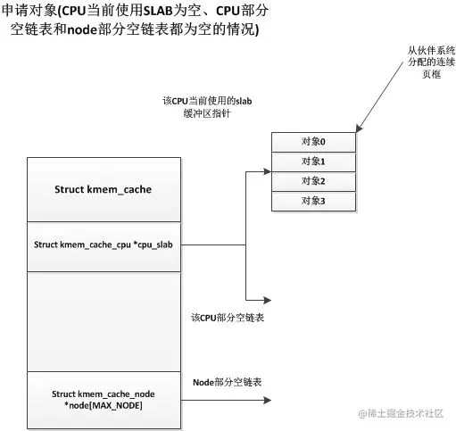 如果node的部分空链表和CPU的部分空链表都为空的情况,那就与我们第一次申请对象的情况一样,直接从伙伴系统中获取连续页框用于一个slab缓冲区。