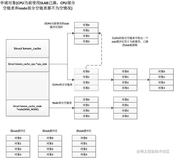 这时候当前CPU获得了一个空闲slab缓冲区,并将其中的一个空闲对象分配出去,而下次申请对象时也会从该slab缓冲区中获取对象,直到此缓冲区中对象用完为止。