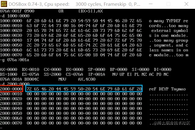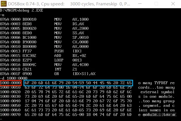 编译,链接并运行可执行文件。程序运行后,内存 2000:0000~2000:000F 的值的存放情况: