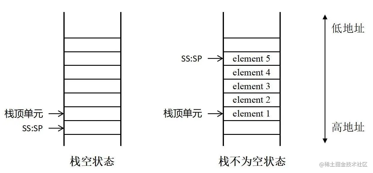 使用段寄存器 SS 和寄存器 SS 来指示栈顶位置,栈顶从高地址往低地址方向增长。即,入栈时 SP 的值减小、出栈时 SP 的值增大。栈为空时,SS:SP 指向栈空间最高地址的下一单元。