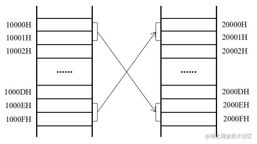 如图所示,将 10000H~1000FH 中的 8 个字逆序拷贝到 20000H~2000F 中。