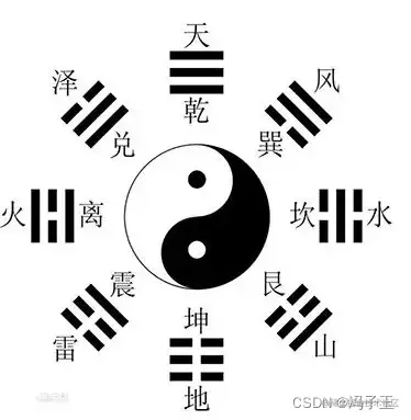 - 八卦:当给我们在四象中增加一爻,也就是三个阴阳组合在一起的时候,我们可以得到八个组合,古人认为这八个组合可以代表自然界中的八类事物(八中状态),即是为八卦