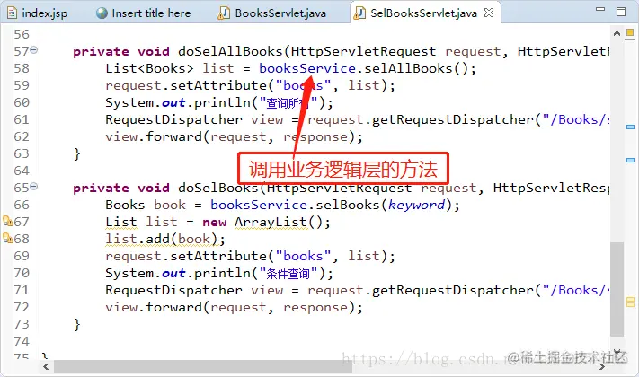 点击查询,我们会跳转到表示层的控制器,也就是Servlet,此时Servle会调用业务逻辑层的方法