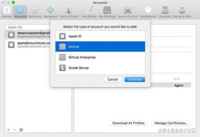 Xcode 和 GitHub 深度整合,現在從 Preferences 視窗的 Accounts 頁面即可設定專案連結的 GitHub 帳號。