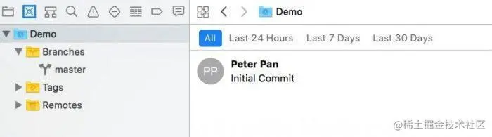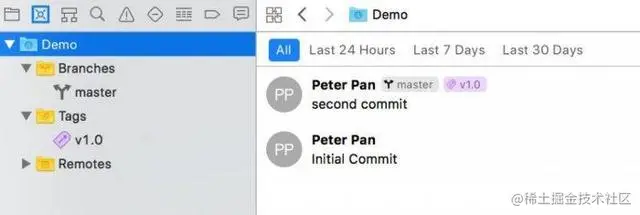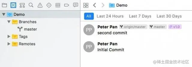 - 在 source control navigator 頁面,選擇第一個藍色 icon,可看到目前專案處在 second commit 的版本。