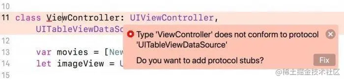 點選 Fix,自動幫我們輸入 UITableViewDataSource 一定要定義的 2 個 function。