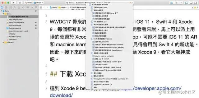 Xcode 支援漂亮地顯示 markdown 檔案,呈現對應的文字大小,而且還能理解檔案內容的階層,方便我們點選 jump bar 選單跳到檔案的某個段落