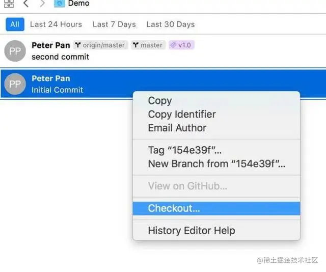 - 選擇 Initial Commit,從右鍵選單點選 Checkout,回到 Initial Commit 的版本。