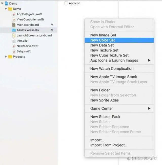 - 在 Assets.xcassets 頁面,從右鍵選單選擇 New Color Set 新增顏色。