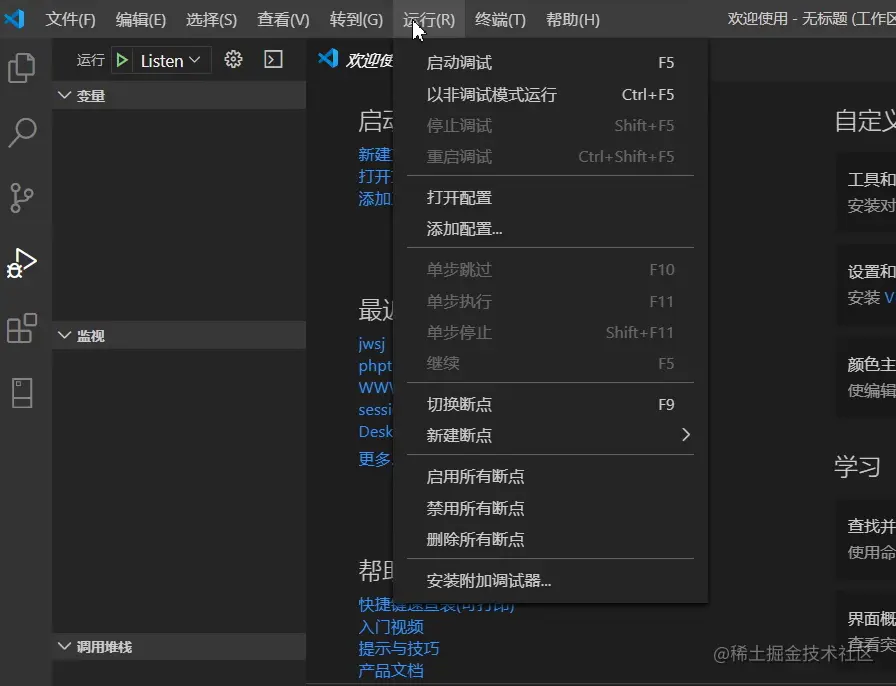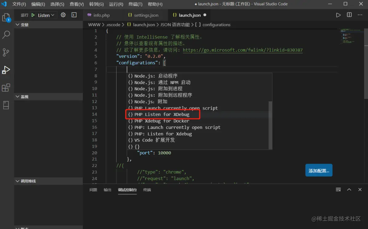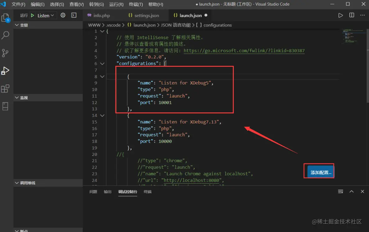 设置完保存。 接着点击菜单栏-->运行选项-->添加配置按钮 编辑launch.json