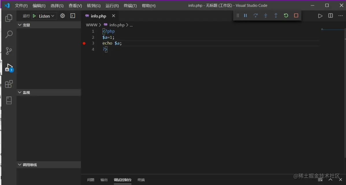 接着创建测试文件,下断点。 F5快捷启动Xdebug,接着运行测试文件: 可以看到断点成功