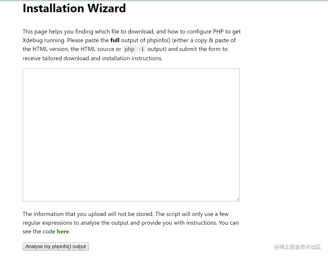 这个需要下载自己PHP运行所对应的版本,如果你知道自己的PHP 安装的版本,则选择对应的版本,如果不知道,可以点击此链接:xdebug.org/wizard ,方框中输入 phpinfo() 的源码页面内容,然后点击 “Analyse my phpinfo() output”,网站就会自动下载对应的xDebug.dll 文件,并告诉我们如何去配置php.ini 文件; 将xDebug.dll下载完后,将dll文件存放到php对应版本中的ext文件夹下,并配置php.ini