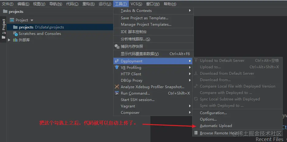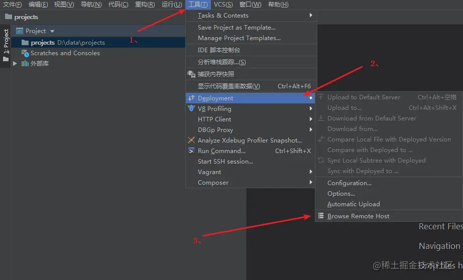 1、打开windows主机的idea(我这里是PhpStorm),打开上面windows系统项目地址:D:/data/projects/,然后选择tools->deployment->brower remote host。如下图:
