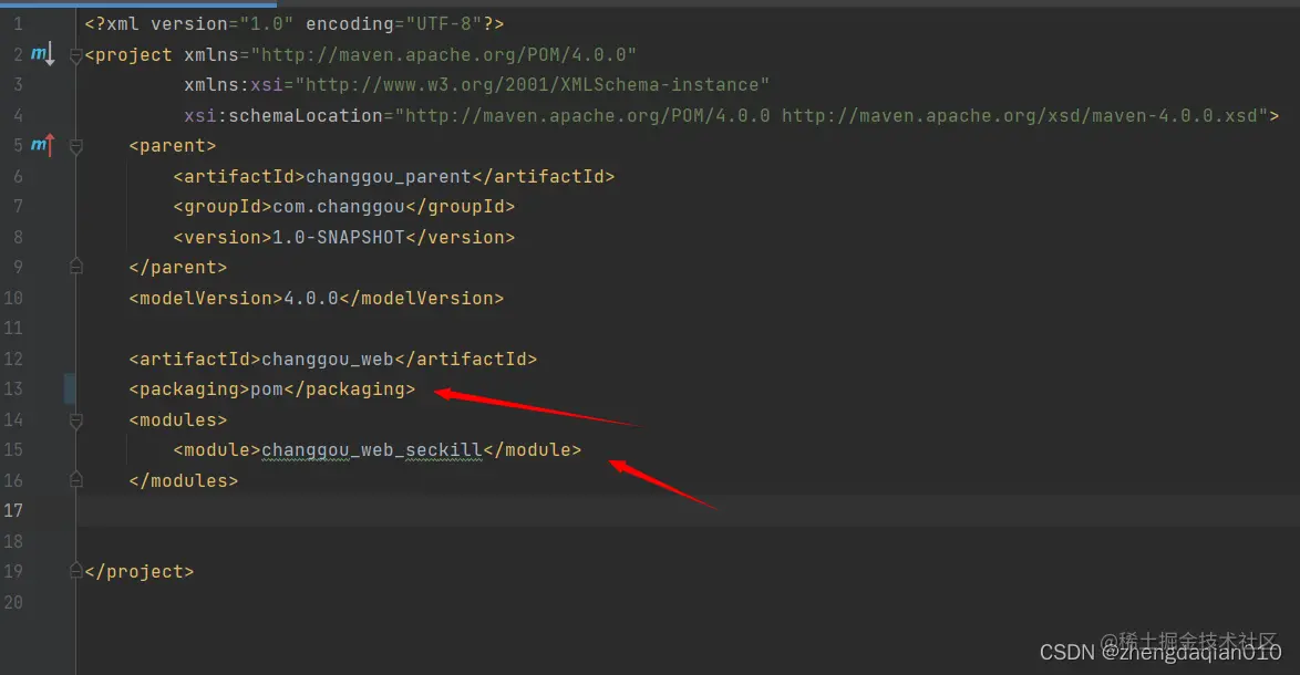 到出问题的pom.xml中一看,它含有子模块,即它是多模块聚合,打包方式应该为pom