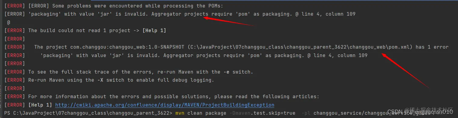 [ERROR] 'packaging' with value 'jar' is invalid. Aggregator projects require 'pom' as packaging. @ line 4, column 109