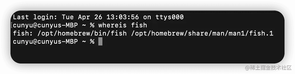 我的电脑安装后 Fish 是位于上面的位置,但是如果你不确定你安装后不知道在哪儿,那么可以使用以下命令进行查询 Fish 所在位置。