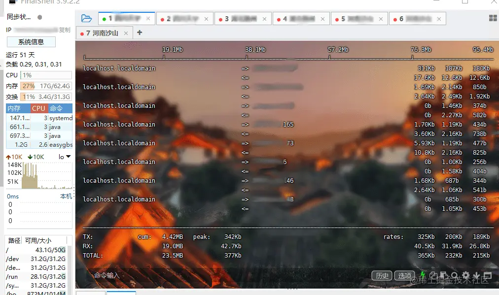 2)如果是Linux系统,可以通过iftop工具,可看到哪些IP地址与服务器上有交互信息,以及流量使用信息。