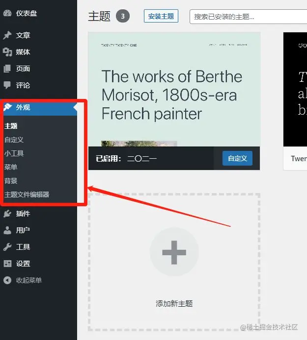 通过这个功能,我们能够对WordPress网站页面进行定义,不仅能对已有的网站页面进行编辑(对网站进行自定义),还能够选择多种主题,应用于我们的网站。