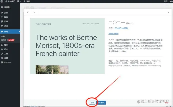 进入主题界面后,点击下方的“启用”按钮。再转入http://localhost页面。刷新一次,就能看到新主题的应用情况。