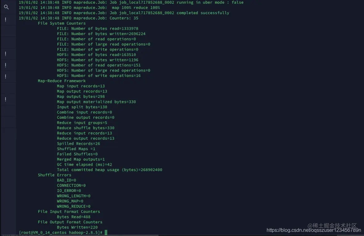 $ ${HADOOP_HOME}/bin/hadoop jar share/hadoop/mapreduce/hadoop-mapreduce-examples-2.8.5.jar grep input output 'dfs[a-z.]+'