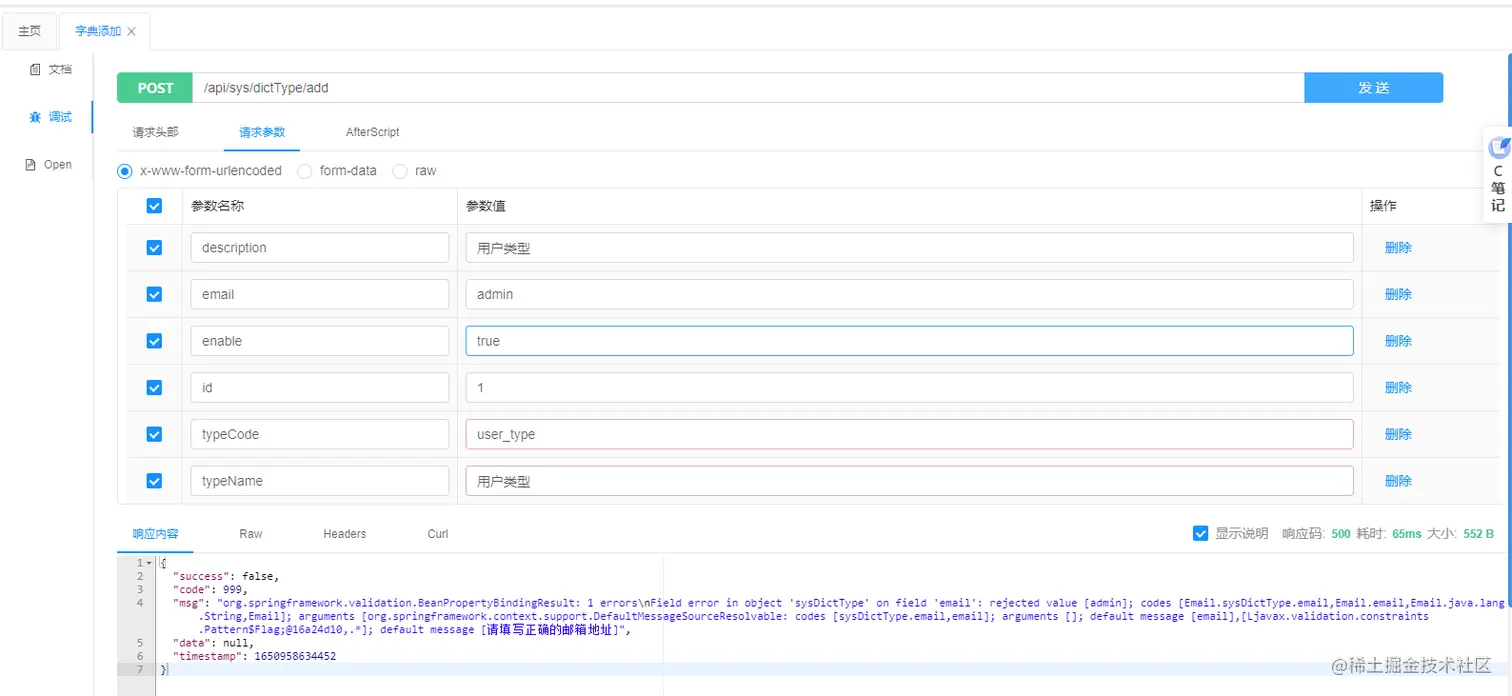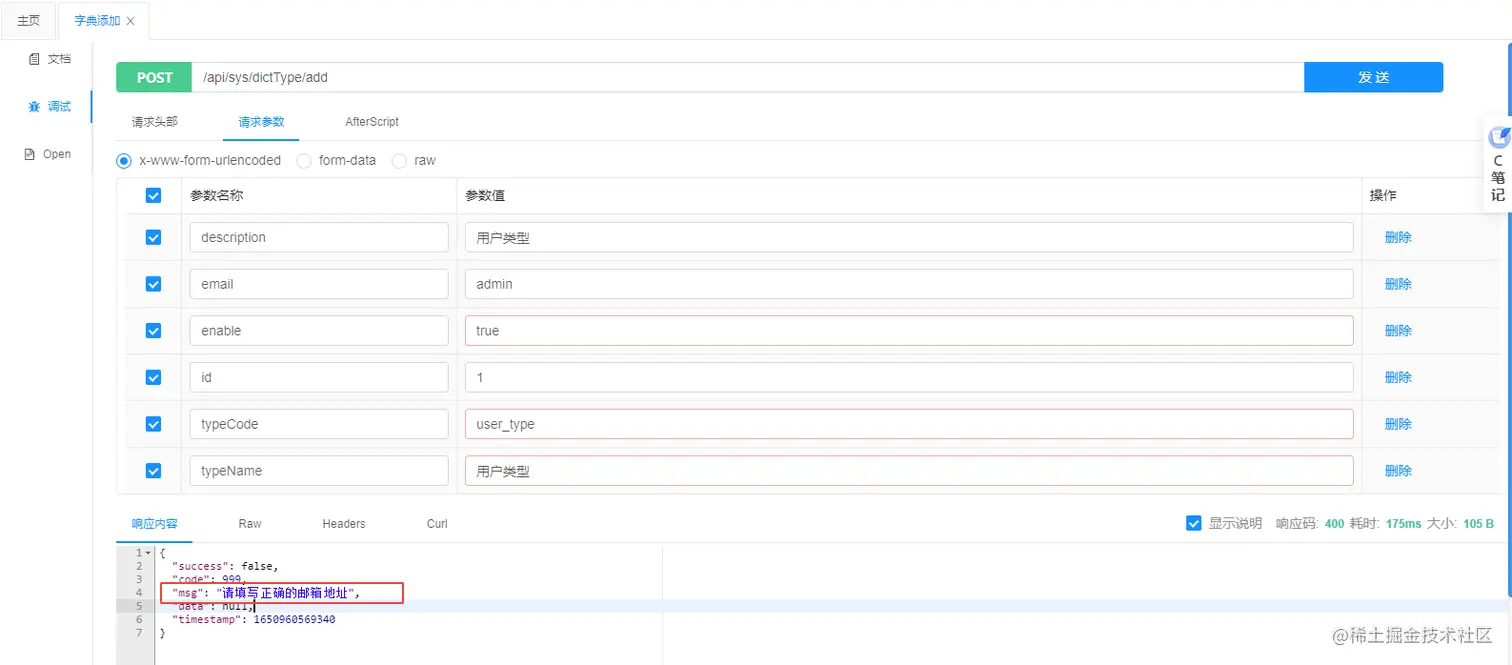 由于email的格式不对就被拦截了,提示是因为邮箱地址不对。