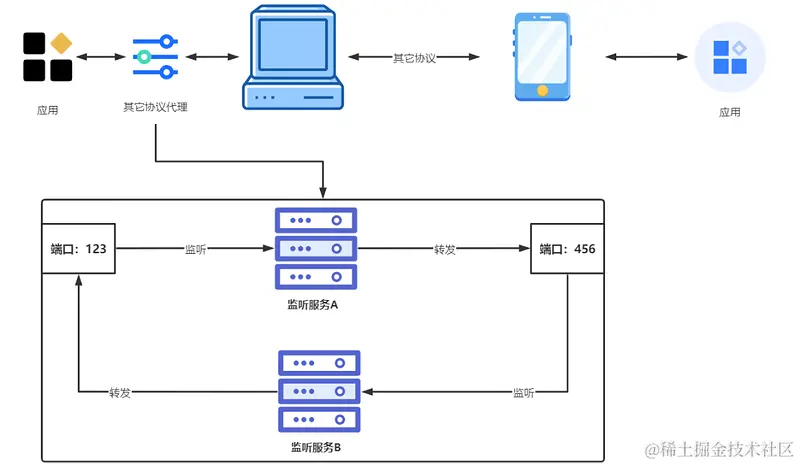 其它协议较 Sokcet 更冷门,无合适的代理工具。需要测试人员自己写代理,比如串口协议, Python 虽然支持 Pyserial 进行收发串口,但无代理。此时需要测试人员自行编写串口代理工具。这个过程需要开启两个监听服务,如下图,监听服务 A 监听端口 123 ,如果有数据进来,会透传(或做数据更改,实现 mock)给端口 456,监听服务 B 同理:\