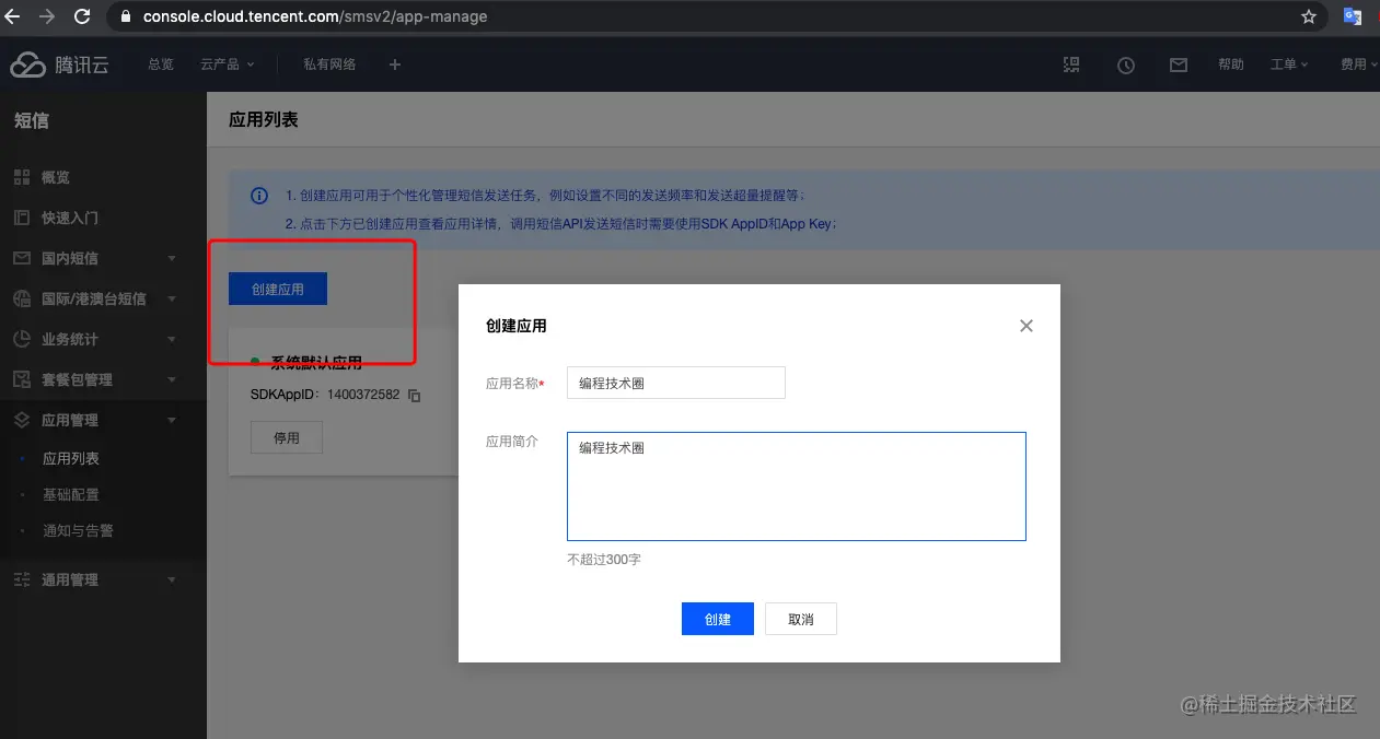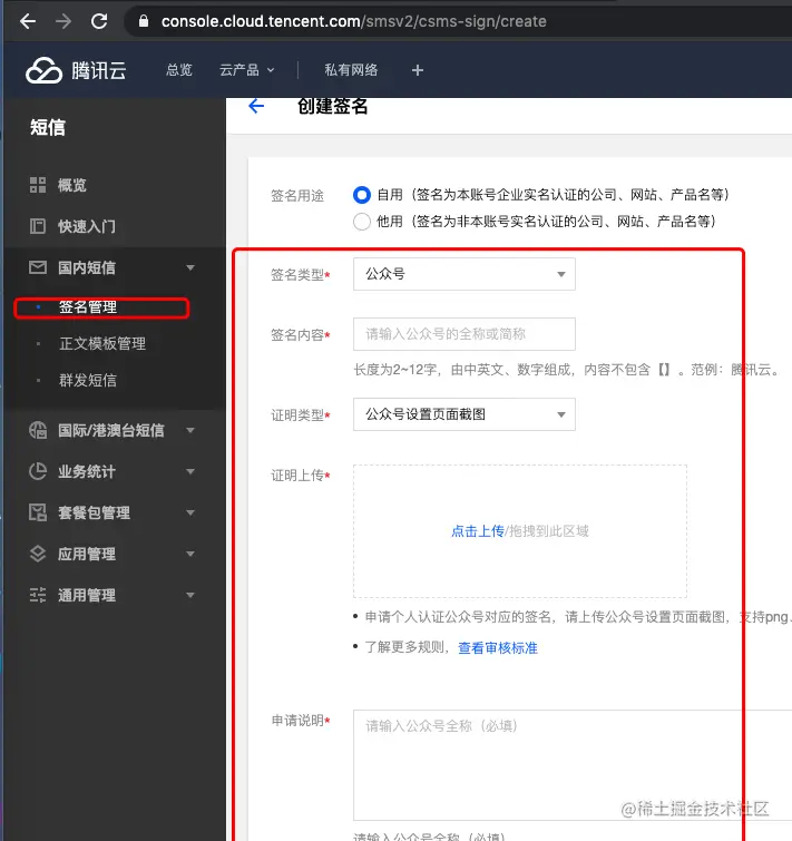 注:需先申请“短信签名”和“短信正文”,按照要求填写申请即可,腾讯云的审核效率还是很快的,一般在1-2个小时内就会有结果
