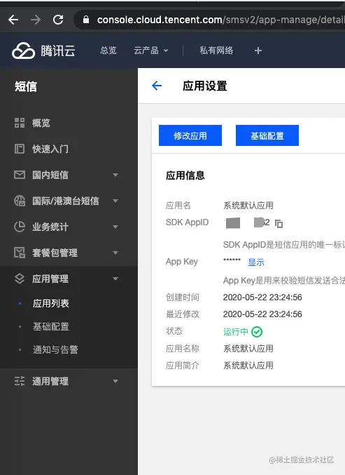 云短信应用SDK AppID和AppKey可在短信控制台的应用信息里获取,如您尚未添加应用,请到短信控制台中添加应用。